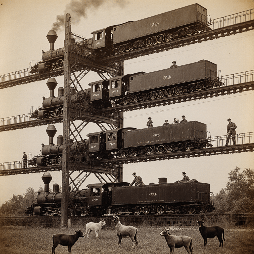 On the day of the grand experiment, five stories of locomotives climbed atop one another, clanking forward as stunned cows watched from below. Up top, passengers pressed their faces to the windows for a view, or perhaps to check they weren’t about to plummet into haystacks. The wobble of each layer felt suspiciously like being jostled inside a mobile stovepipe.