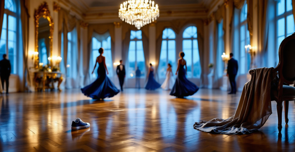 The music never reveals its source. The windows bathe the room in blue, crystals tremble like they are keeping time, and the long gilded mirror snags a quick glimpse of someone practicing an immaculate pivot before looking perfectly innocent again.